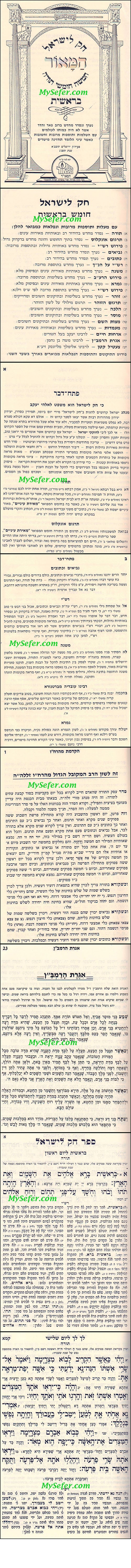 Classic work studied daily which contains portion of the weekly Torah reading, Aramaic translation, Onkelos, Rashi, section from the prophets, writings, Mishnah, Talmud, Zohar, ethical writings and Jewish law.[fine print]