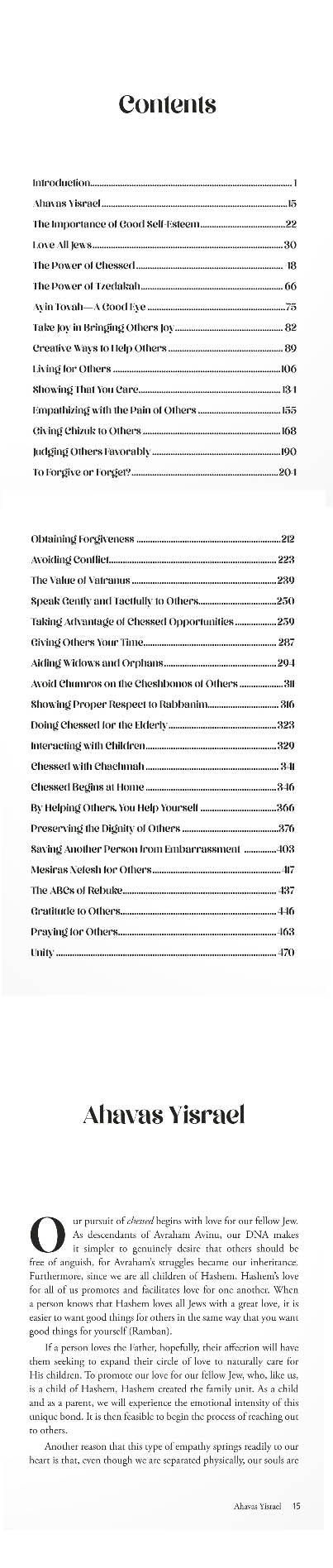 In this book you will find many ideas, tips, and suggestions on how to communicate and bond with others. Simple exercises are offered at the end of each chapter, to facilitate mastery of these transformative interpersonal skills. Also included are numerous stories that offer practical lessons and concrete inspiration, which will guide the reader to achieve the necessary emotional clarity and make the right choices in the area of bein adam l'chaveiro.