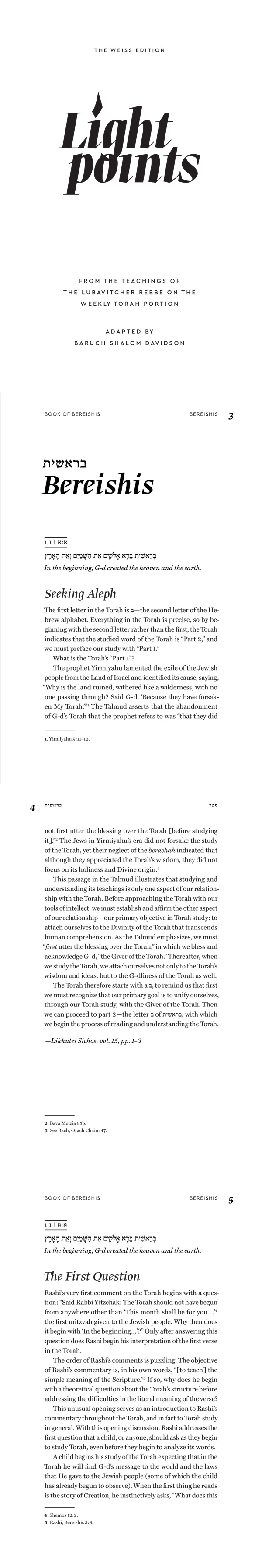 This collection aims to provide the English-speaking community with a taste of the Rebbe's vast contributions to Jewish scholarship. Some Lightpoints focus more on the Torah and its commentaries; others highlight the relevance of the Torah's lessons in our day and age. As their name indicates, the Lightpoints are intended to be short and easy to read, but more importantly, they are points of light to illuminate our perspective on the Torah, and direct us along the Torah's path of truth and holiness that guides our lives.