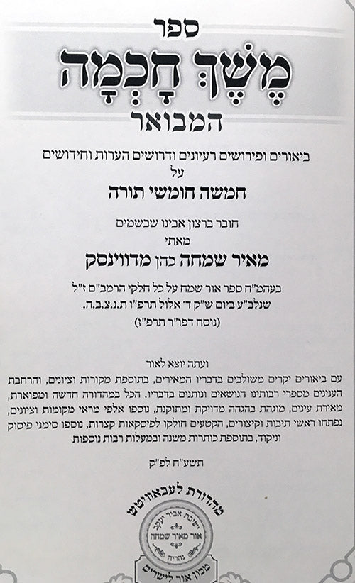 A classic commentary on the Torah and Chamesh Megillot, a unique blend of Halakha, thought and commentary. In it Rabbi Meir Simcha HaKohen of Dvinsk (1843-1926) demonstrates the unity between the written and oral laws and presents strikingly original interpretations of both Biblical verses and Talmudic passages.