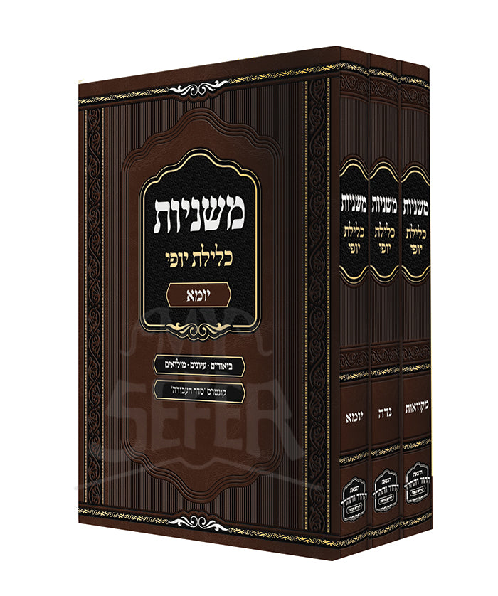 English Summary: The Mishnayot Modaah Kleylat Yofei is a comprehensive 3-volume set focusing on the teachings and insights from the Mishnah, with a particular emphasis on the laws and principles of Modaah—a tractate that covers various areas of Jewish law. Each volume includes detailed explanations, practical applications, and reflections on the text, making it an essential resource for scholars and students seeking a deeper understanding of Jewish law and tradition. The set provides both historical context and contemporary relevance, appealing to readers who wish to delve into these ancient texts with clarity and insight.