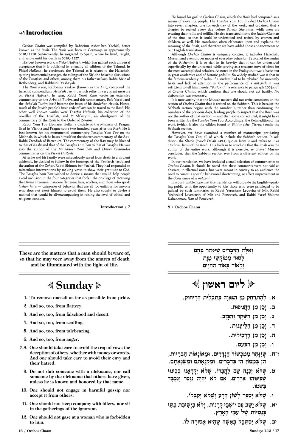 How important is Orchos Chaim? The Tosafos Yom Tov wrote a commentary. The great baalei Mussar made it a textbook of personal behavior. Rabbi Simchah Zissel of Kelm, molder of leading baalei Mussar, said that it was worthwhile to have founded his yeshivah in Kelm merely for the sake of the regular study of Orchos Chaim. Rabbi Yaakov Kamenetsky worked on the order of the maxims. If Orchos Chaim was so precious to such giants, how much more should it mean to the rest of us?