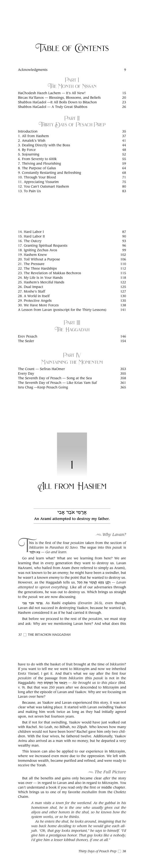 An inspirational and absorbing Haggadah, with emunah and bitachon at its center. This remarkable work is a literal two-in-one: a 30-day daily reader and a full Haggadah with commentary, preparing you to experience the true freedom of Pesach in a way you never have before.