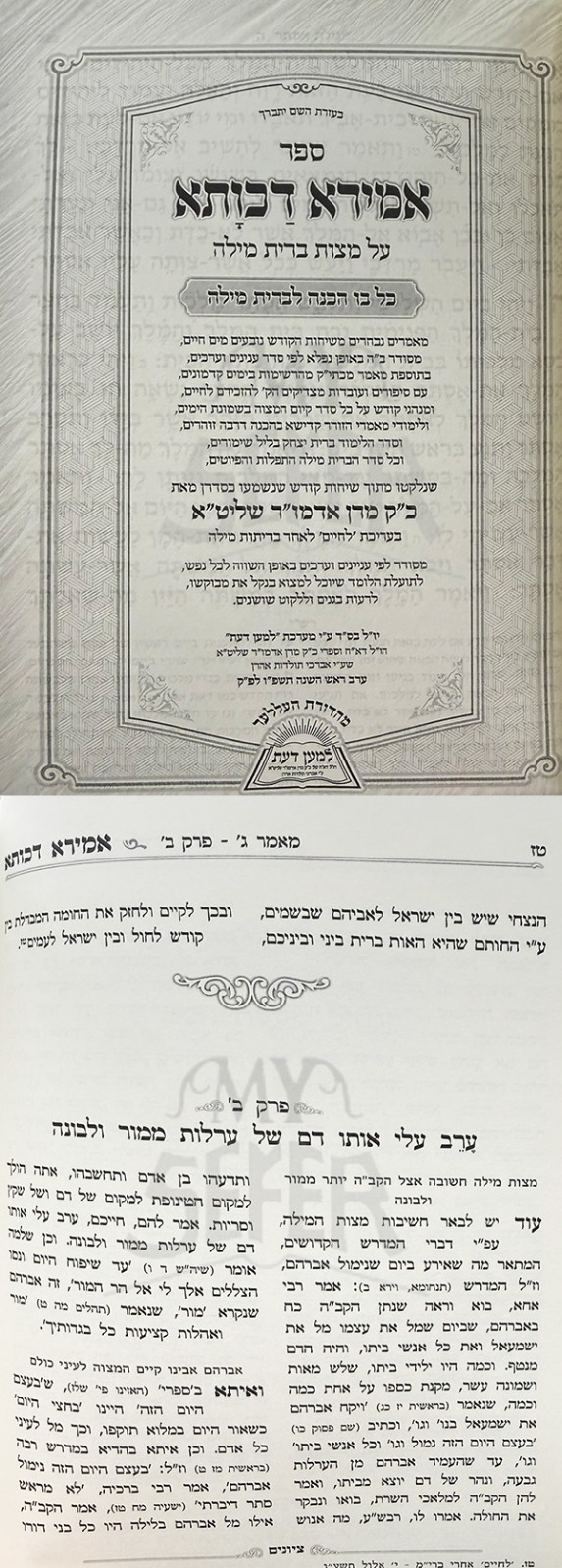 ספר אמירא דכותא על מצות ברית מילה כל בו הכנה לבדית מילה מאמרים נבחרים משיחות הקודש נובעים מים חיים, מסודר ב"ה באופן נפלא לפי סדר ענינים וערכים, בתוספת מאמר מכתי"ק מהרשימות בימים קדמונים, עם סיפורים ועובדות מצדיקים הק' להזכירם לחיים, ומנהגי קודש על כל סדר קיום המצוה בשמונת הימים, ולימודי מאמרי הזוהר קדישא בהכנה דרבה זוהרים, וסדר הלימוד ברית יצחק בליל שימורים, וכל סדר הברית מילה התפלות והפיוטים, שנלקטו מתוך שיחות קודש שנשמעו כסדרן מאת כ"ק מרן אדמו"ר שליט"א בעריכת 'לחיים' לאחד בריתות מילה מסודר לפי עניינים וערכים באופן השווה לכל נפש, לתועלת הלומד שיוכל למצוא בנקל את מבוקשו, לדעות בגנים וללקוט שושנים. יו"ל בס"ד ע"י מערכת "למען דעת" הו"ל דא"ח וספרי כ"ק מרן אדמו"ר שליט"א שע"י אברכי תולדות אהרן ערב ראש השנה תשפ"ו לפ"ק מהדורת העללער למען דעת דא"ח של כ"ק מרן אדמו"ר שליט"א ע"י אברכי תולדות אררן