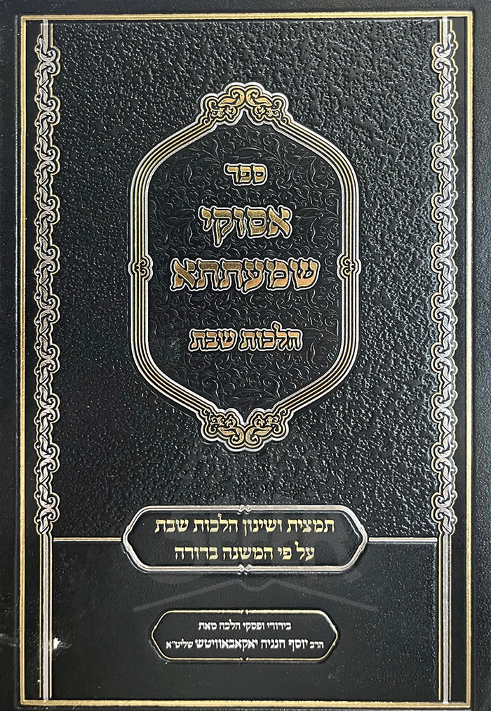 Hebrew: ספר אסוקי שמעתתא-הלכות שבת הוא מחקר מפורט ואנליטי של דיני השבת. הספר מספק כיסוי מקיף של האיסורים והמצוות השונות הקשורות לשמירת השבת. הוא כולל דיונים מעמיקים על ל"ט המלאכות (קטגוריות העבודה האסורות בשבת), עקרונות המנוחה והקדושה, ויישומים מעשיים לחיים המודרניים. הטקסט נועד לענות על צרכיהם של חכמי התורה המתקדמים ושל אלו המבקשים להעמיק בהבנת דיני השבת.