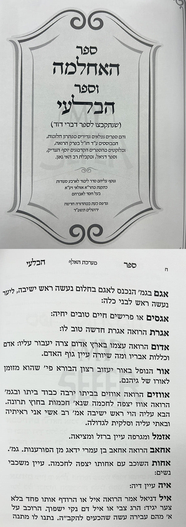Hebrew Summary: ספר האחלמה הוא ספר המוקדש לפתרון חלומות במסגרת המסורת היהודית. הספר חוקר שיטות ועקרונות שונים להבנת חלומות, תוך שהוא נשען על מקורות קלאסיים כמו התלמוד והמדרש. הספר מספק הסברים מפורטים על סמלים שכיחים בחלומות ומשמעותם, ומציע תובנות כיצד חלומות יכולים לשקף את מצבו הרוחני והרגשי של האדם. זהו משאב חשוב למתעניינים בהיבטים המיסטיים והפסיכולוגיים של חלומות במחשבה היהודית.