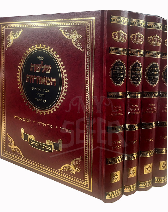 "Sheloshes HaMeoros 4 Volume Set" is a comprehensive collection of commentaries on Rashi's interpretation of the Torah. This set provides detailed explanations and insights into Rashi's commentary, elucidating his interpretations and offering additional perspectives from various other commentators. Each volume aims to deepen the reader's understanding of the Torah and enhance their appreciation of Rashi's work. The set is designed for scholars and students alike, providing a valuable resource for studying and exploring the depths of the Torah through Rashi's lens.