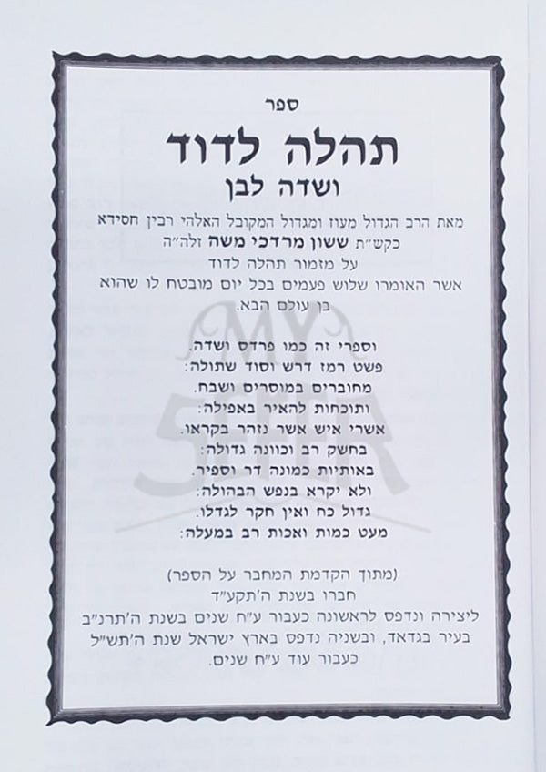 Tehillah LeDavid/ תהלה לדוד - שדה לבן / מאת המקובל רבי ששון מרדכי זצוק"ל