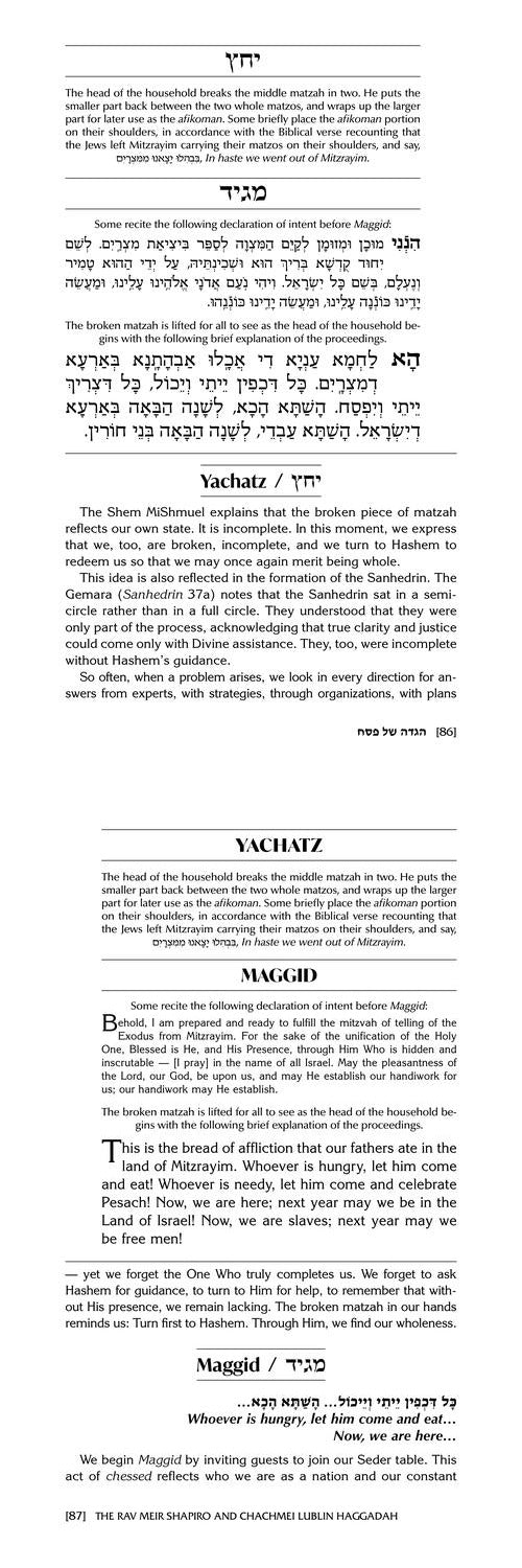This beautifully crafted Haggadah brings the spirit of Yeshivas Chachmei Lublin to the Pesach Seder table, with teachings rooted in the Torah and legacy of R’ Meir Shapiro, together with the other towering figures of the yeshivah. Drawn from their divrei Torah, lives, stories, and messages, it presents Yetzias Mitzrayim as a living journey of emunah, bitachon, growth, and redemption, with ideas that are practical and deeply meaningful today.