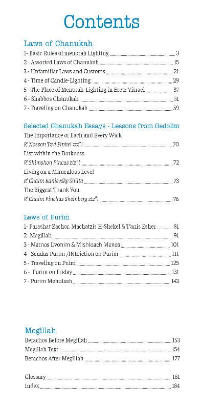 Here is a wonderful, innovative blend of pertinent, easy-to-read, practical halachah embellished by insightful lessons from Gedolim, Food for Thought; fascinating factual asides; full-color, step-by-step guides to Megillah & Menorah; plus – the whole Megillah text, and more. This Purim, treat yourself to this stimulating, joyous, and fulfilling learning experience.
