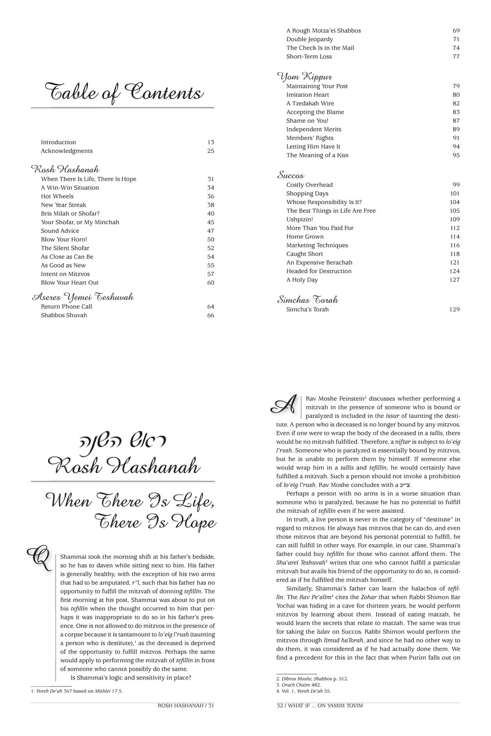 The bestselling and beloved What If? series has become a welcome staple at our Shabbos tables. Based on the popular Hebrew-language series Chashukei Chemed, written by noted rav and posek Rav Yitzchok Zilberstein shlita, and translated and arranged by Rabbi Moshe Sherrow, every volume in the What If? series includes hundreds of real-life halachic questions, each accompanied by a brief, practical scenario to illustrate the case, and an answer that is understandable and easy to follow. Make your holiday table extra-special with the great conversation starter, What If on Yamim Tovim.