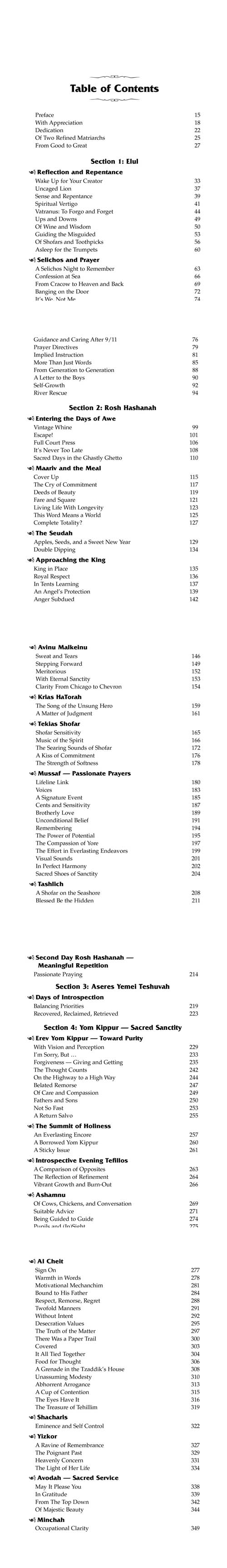 Yamim Noraim with the Maggid includes fascinating insights into the month of Elul, Selichos, Rosh Hashanah, Tzom Gedaliah, Aseres Yemei Teshuvah, and Yom Kippur, as well as commentary on select portions of the Machzor.