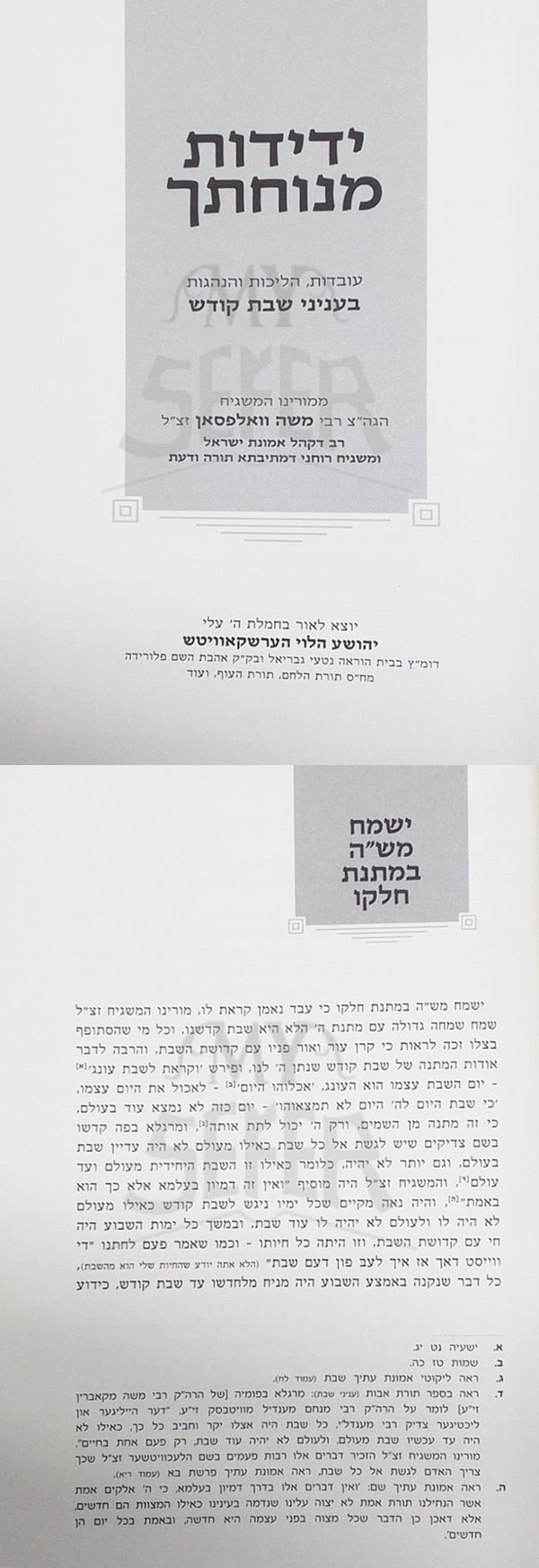 Yedidos Menuchasech - Halichos V'Inyanei Shabbos Kodesh ידידות מנוחתך על הלכות ועניני שבת קודש - רבי משה וואלפסאן זצ"ל